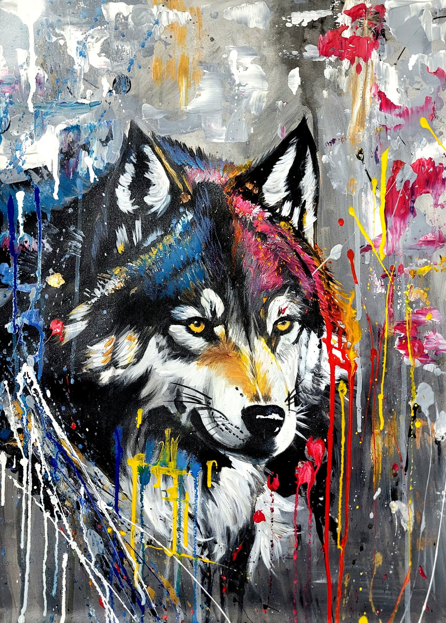 Dieser Wolf hat im Grunde genau 1 Jahr gedauert. Ich habe dieses Bild mit dem Wolf erstellt und ein Jahr später entschieden ihn mit schönen Farben zu versehen. Ein Hingucker für Wolfliebhaber und farbenfrohe Menschen.